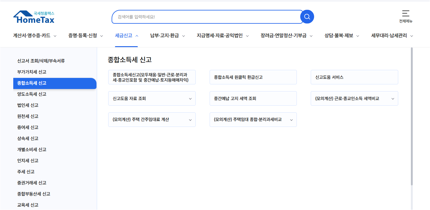 - 신고/납부 메뉴 이동: 상단 메뉴에서 [세금신고] -> [종합소득세]를 클릭합니다.